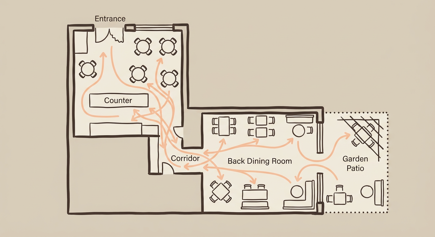Centralny korytarz (~1,5 m szerokości) – wąskie przejście łączące przód z główną salą. To główna autostrada dla obsługi niosącej menu, notesy z zamówieniami i talerze.